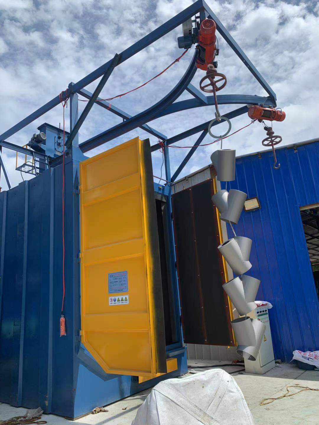 吊鉤式拋丸清理機(jī)為吊鉤式清理設(shè)備,由拋丸清理室、提升機(jī)、分離器、螺旋輸送器、兩個(gè)拋丸器總成、彈丸控制系統(tǒng)、吊鉤行走軌道、吊鉤系統(tǒng)、自轉(zhuǎn)裝置、地基、除塵系統(tǒng)及電氣控制部分等組成。